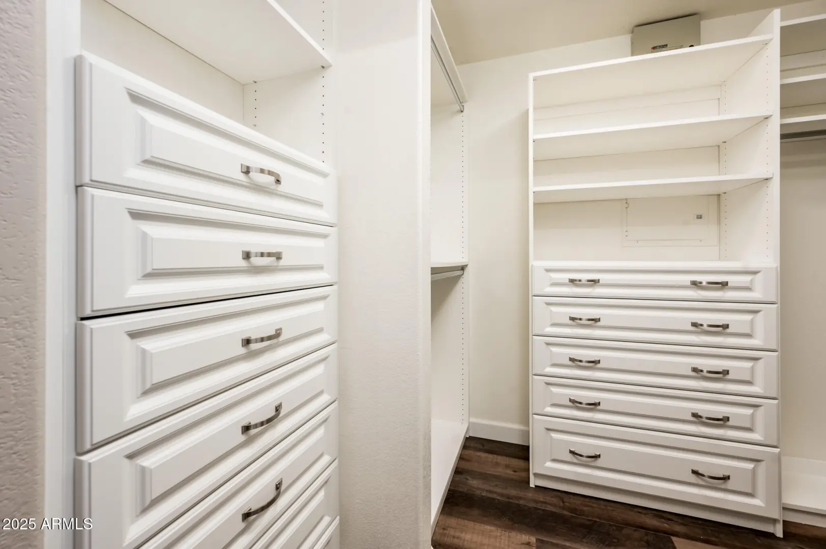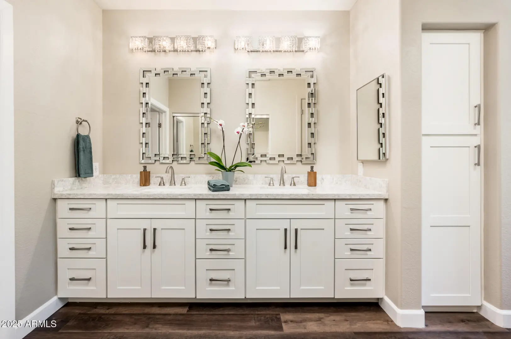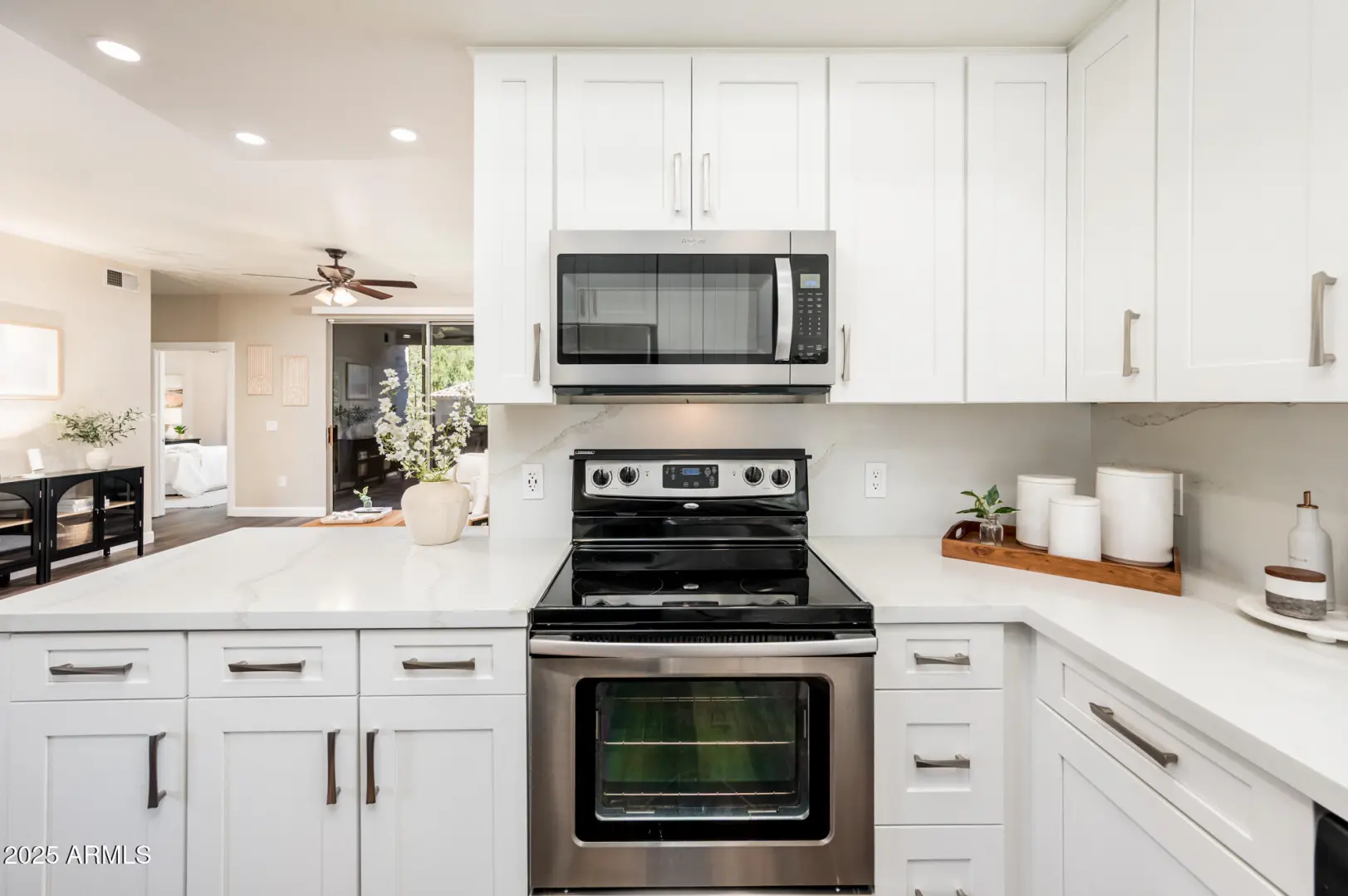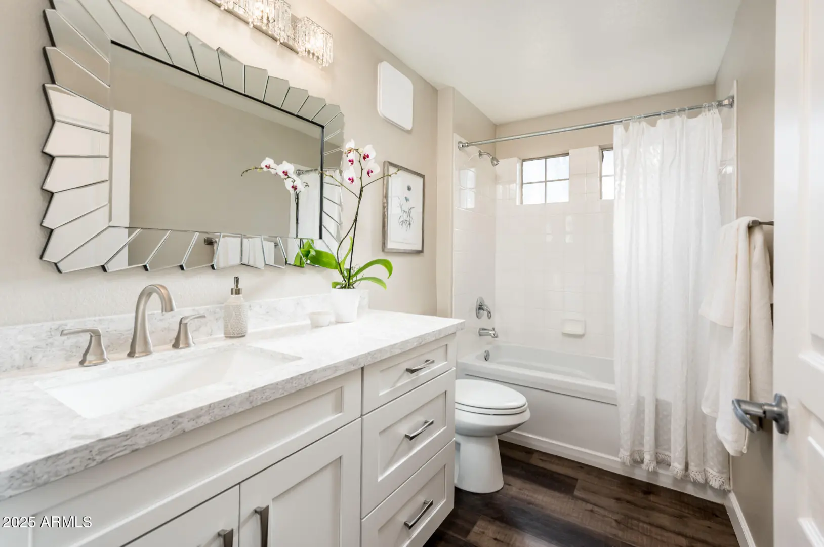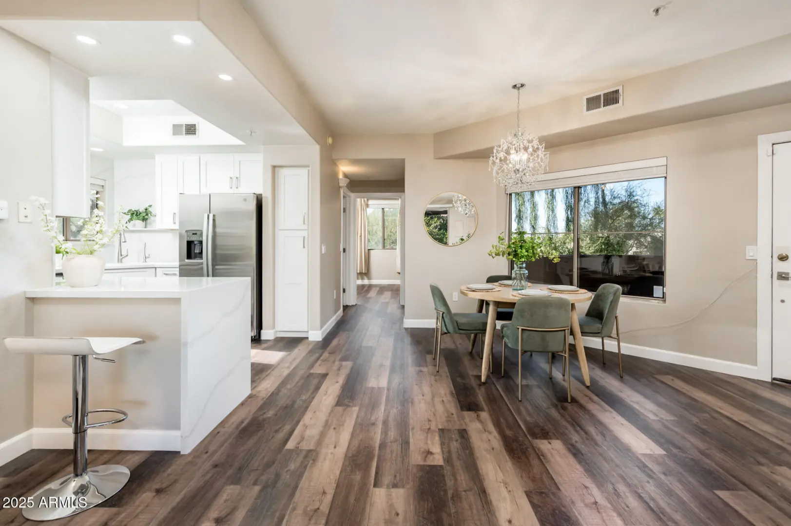 Welcome to effortless Scottsdale living in this beautiful fully-remodeled 2-bed, 2-bath upper-level condo offering comfort, privacy & style. Your private stairwell leads to a front covered patio for evening light across the trees, then enjoy a 2nd covered patio for morning coffee with mountain views. Sophisticated updates include Timberlake Cabinetry with pull-outs, Calacatta Gold Cambria & Cambria Sandgate quartz counters, stainless appliances, new LVP flooring, lighting and California Closets system. All the details-soft-close drawers, new HVAC & water heater, plumbing, RO & whole-house water filtration-speak to quality & care. The community offers reserved covered parking, heated pool & spa, clubhouse, gym and walking paths within a quiet gated community close to all services. Enjoy!