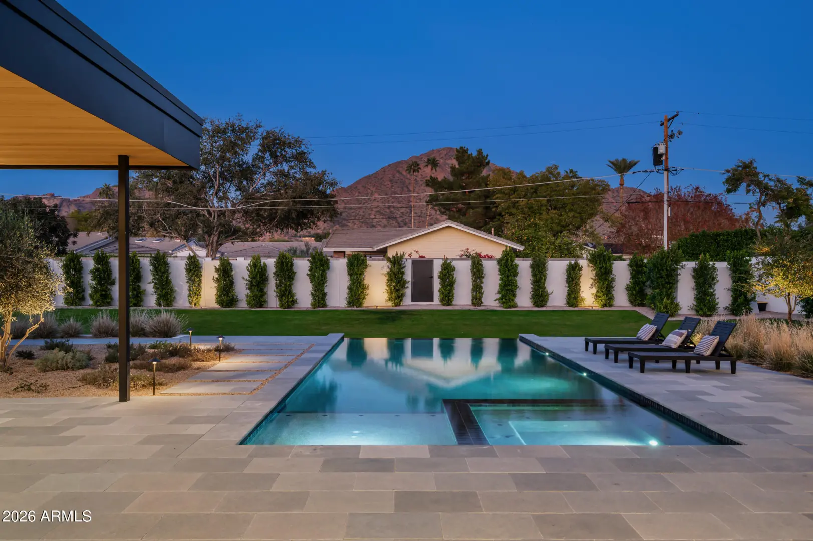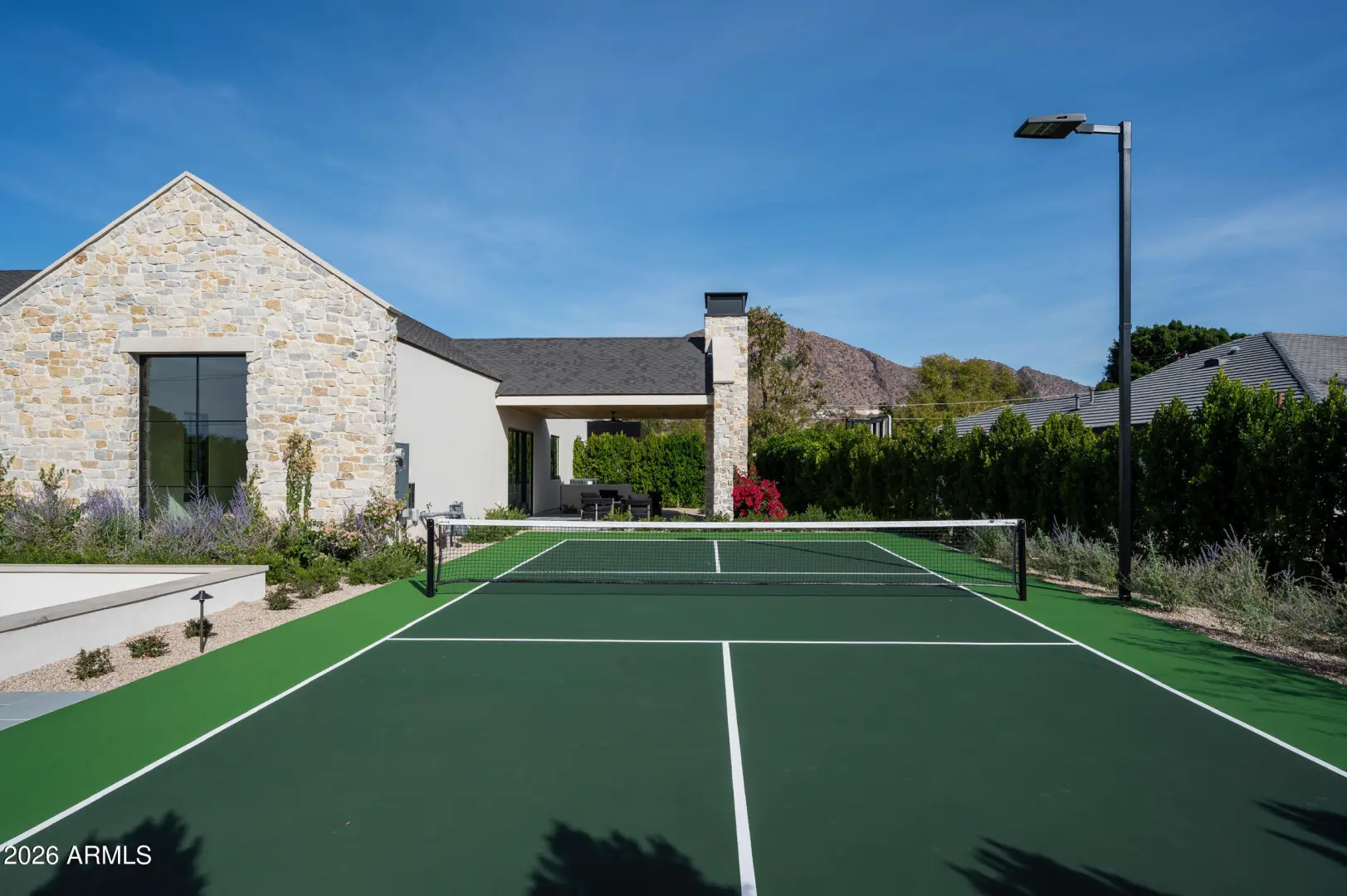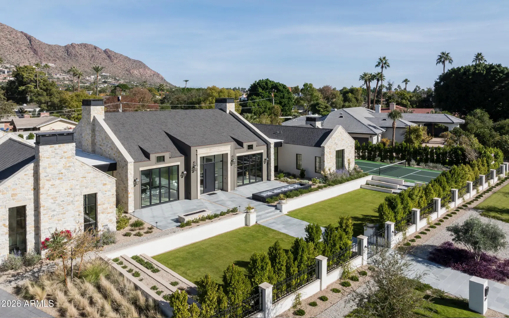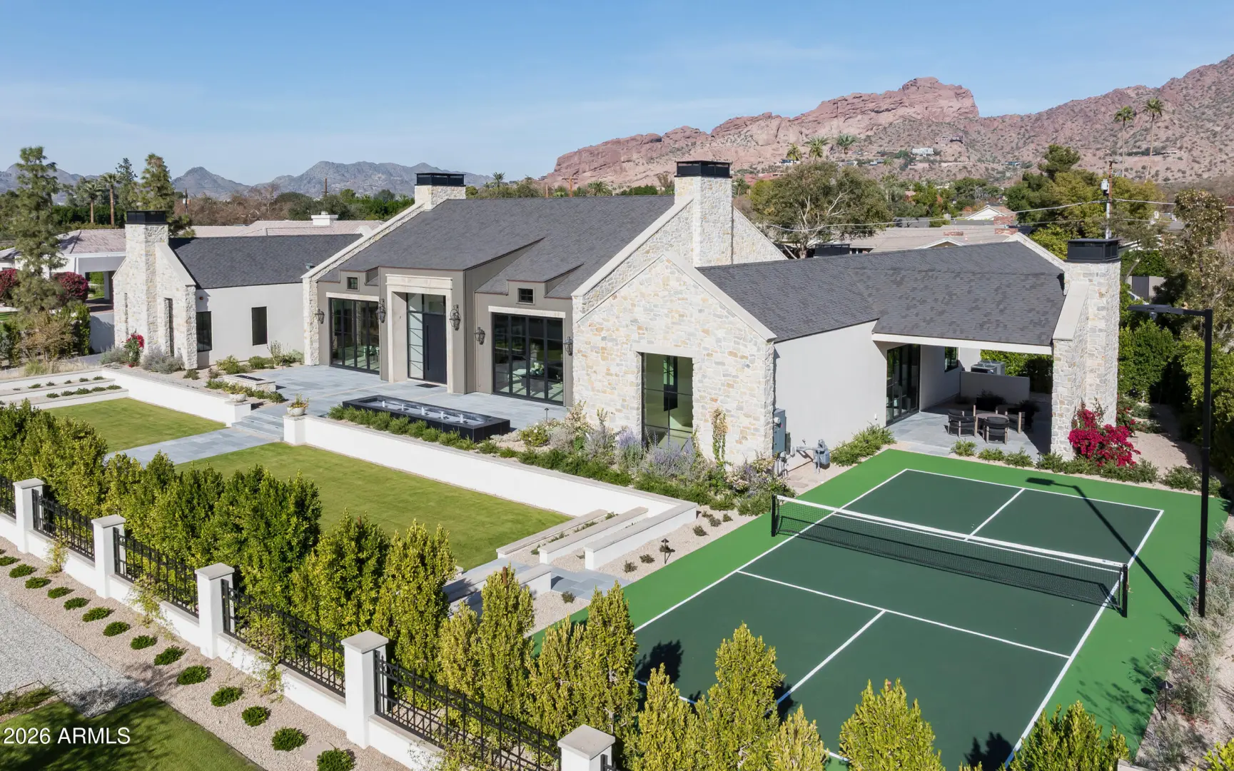 Brand new French Country-inspired estate by Two Hawks Design & Development in the heart of Arcadia. Sitting on .86 acres with 7,164 SF of living space, this timeless home blends classic European design with modern luxury. It features 5 bedrooms, 5.5 baths, 2 living areas, and 2 bonus rooms—plus a 4-car garage. Soaring ceilings and expansive windows frame Camelback Mountain views, while the resort-style backyard includes a pool, spa, lush landscaping, and pickleball court. Optional plans for a guest house or pool cabana available. A rare, fully finished masterpiece ready for its first owner.
