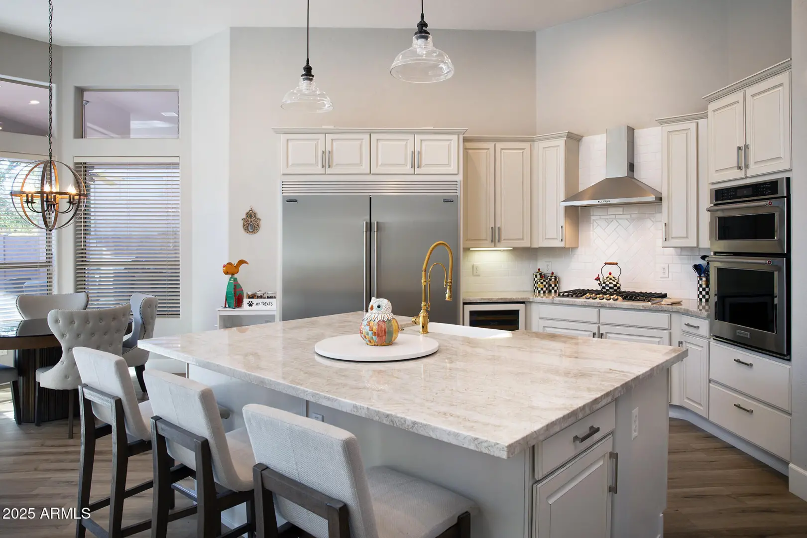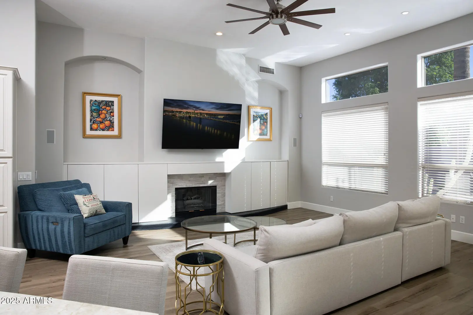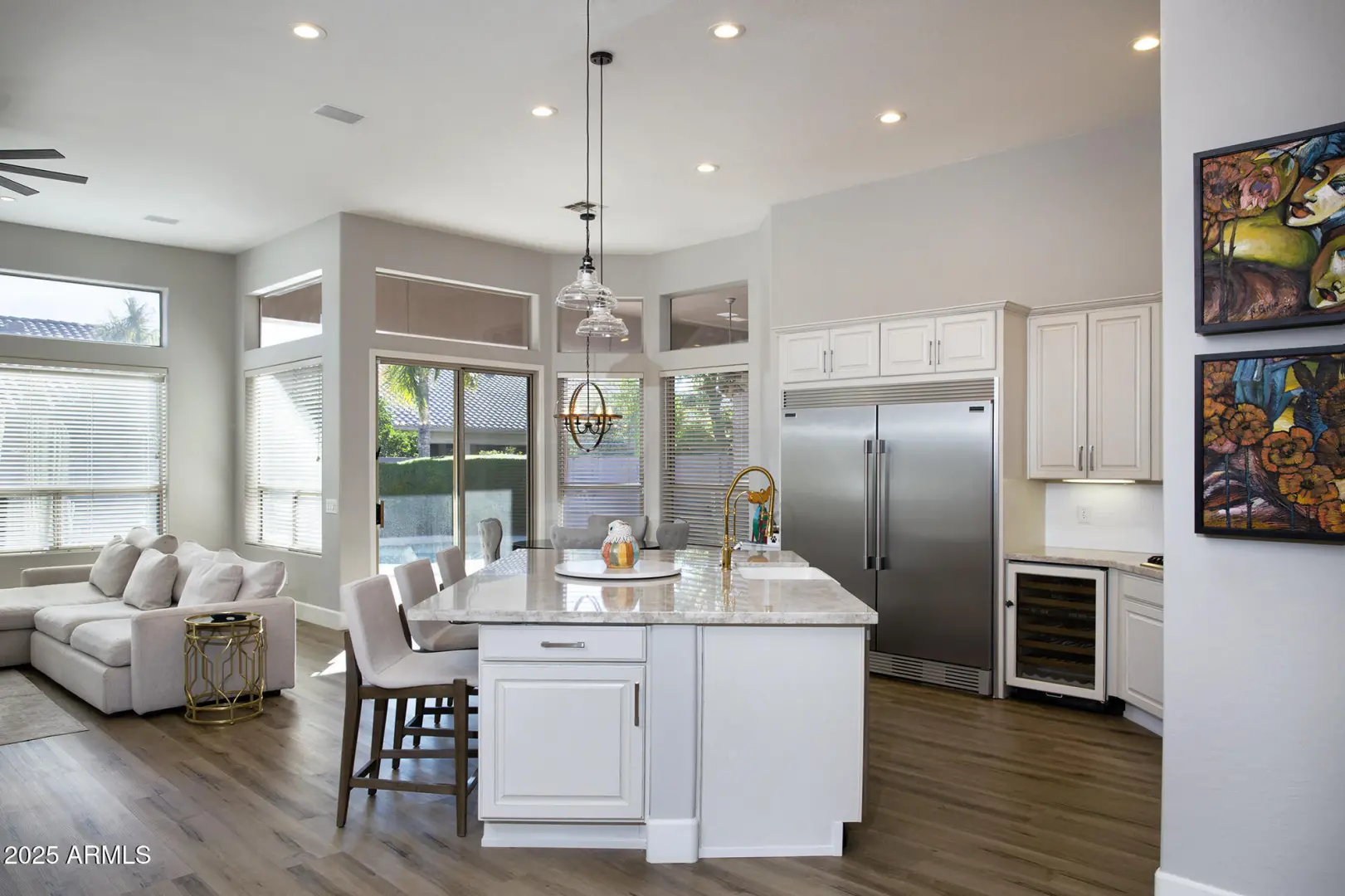 Located in the exclusive neighborhood of Churchill Downs of Triple Crown this home has been remodeled to an open floor plan with dramatic 12' flat ceilings from DR, Kitchen and Great room. The split floor plan includes 3 bedrooms plus a den/office or 4th bedroom. The spacious kitchen include stainless appliances, Subzero wine fridge with large island overlooking the great room w/fireplace.The Primary suite has a large bath with 2 closets. The south-facing backyard includes a pebble sheen play pool and built-in BBQ. Community features include community park, basketball, volleyball, playground & picnic area. Located near the 51, Mayo, Desert Ridge & Kierland.