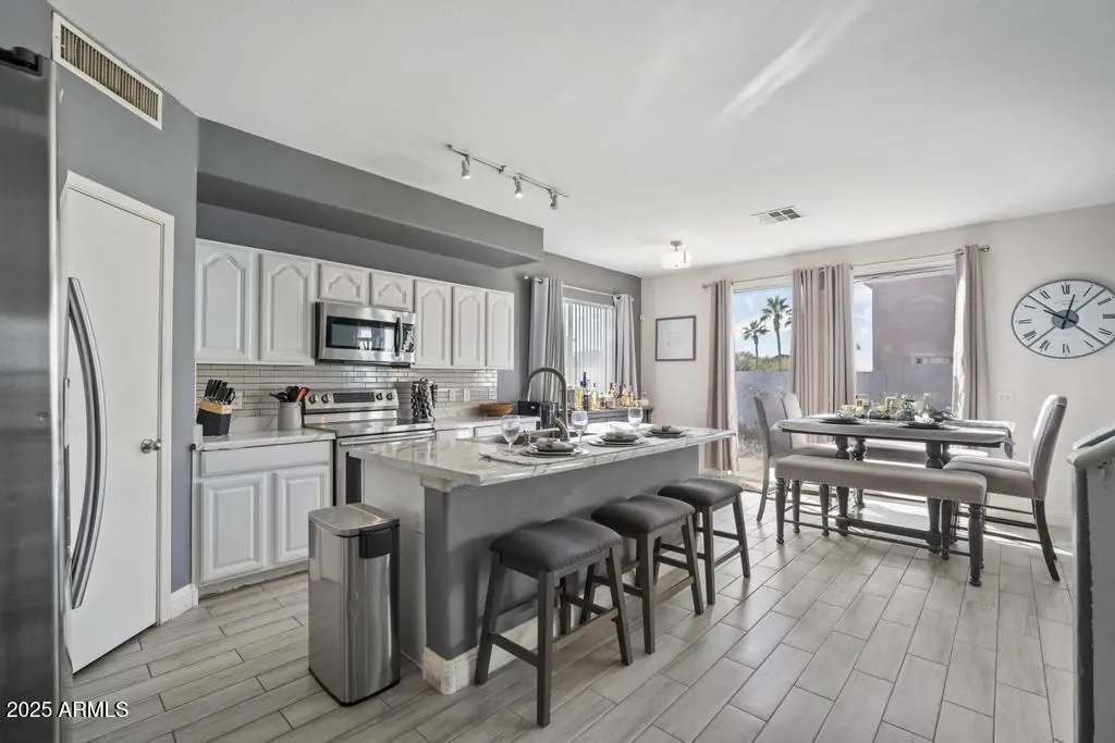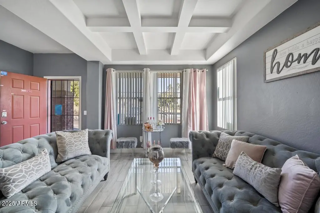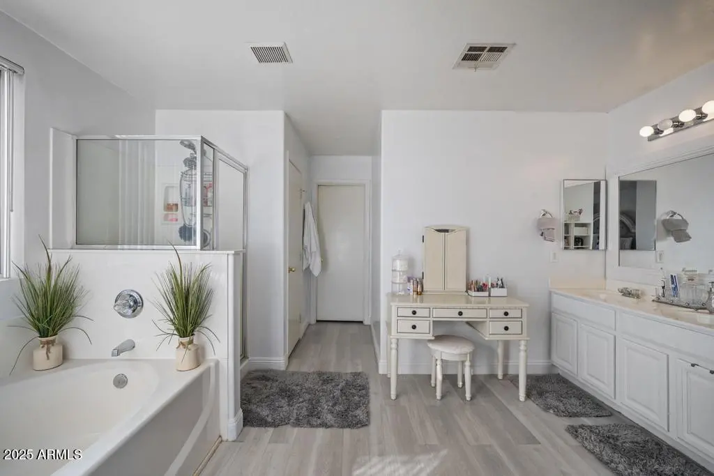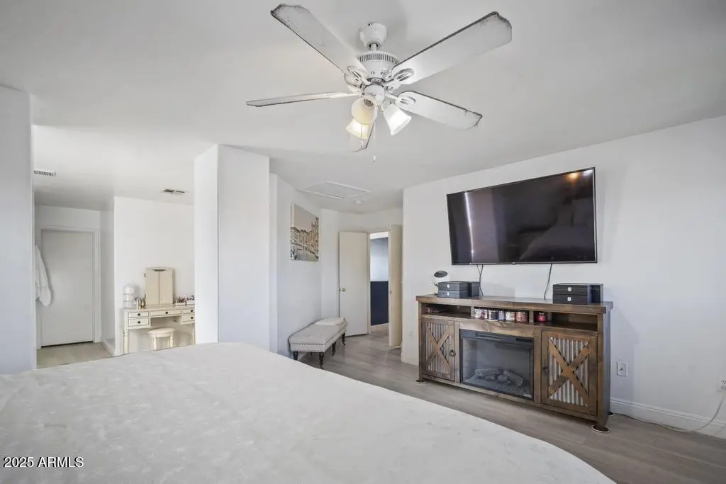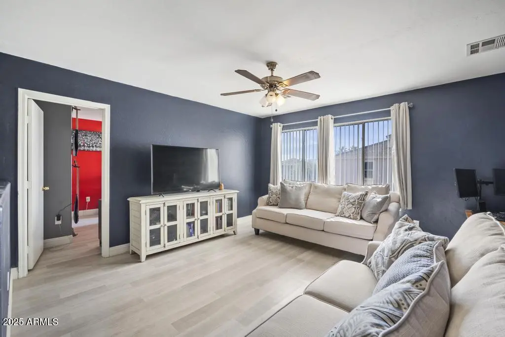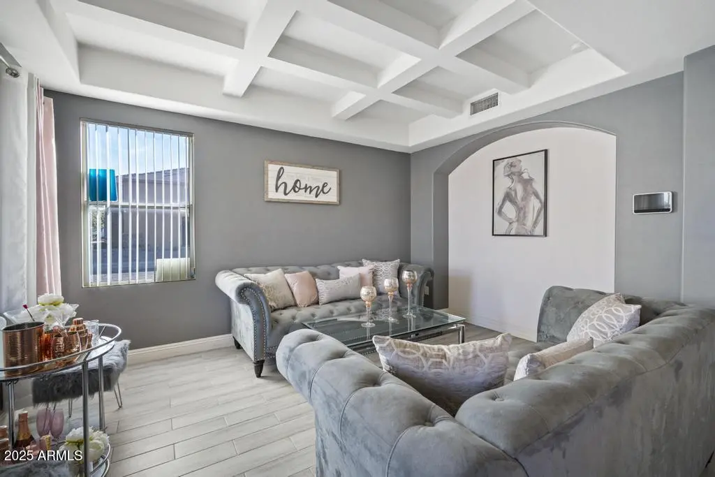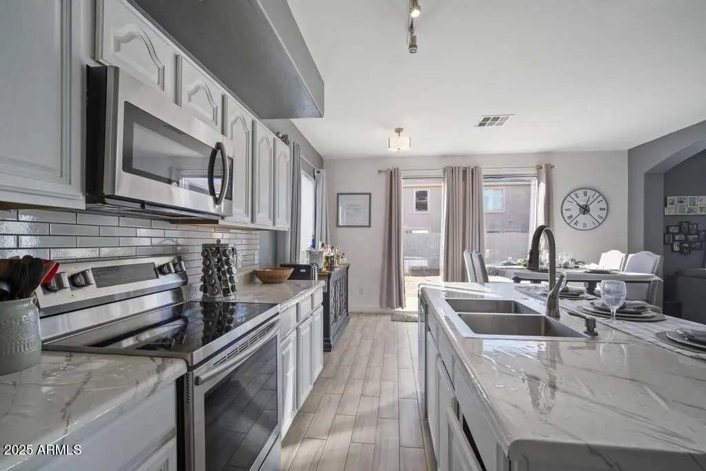 Welcome to the beautifully updated home offering modern style, flexible living spaces, and room to grow. Step inside to a bright, open downstairs featuring a front room with elegant coffered ceilings — perfect as a formal living space or a spacious home office. The main level showcases new flooring throughout and an updated kitchen with freshly painted cabinets and stylish backsplash, flowing seamlessly into the living room with a remodeled gas fireplace and mounted LG TV included. A chic powder bath with an accent wall completes the downstairs. Upstairs, enjoy a generous loft with built-in desk area, ideal for work, play, or an additional lounge. The private primary suite features double-door entry, a relaxing soaking tub, separate shower, dual sinks, and a large walk-in closet.