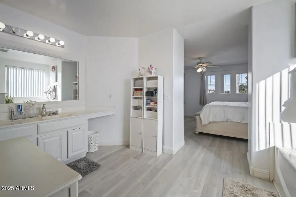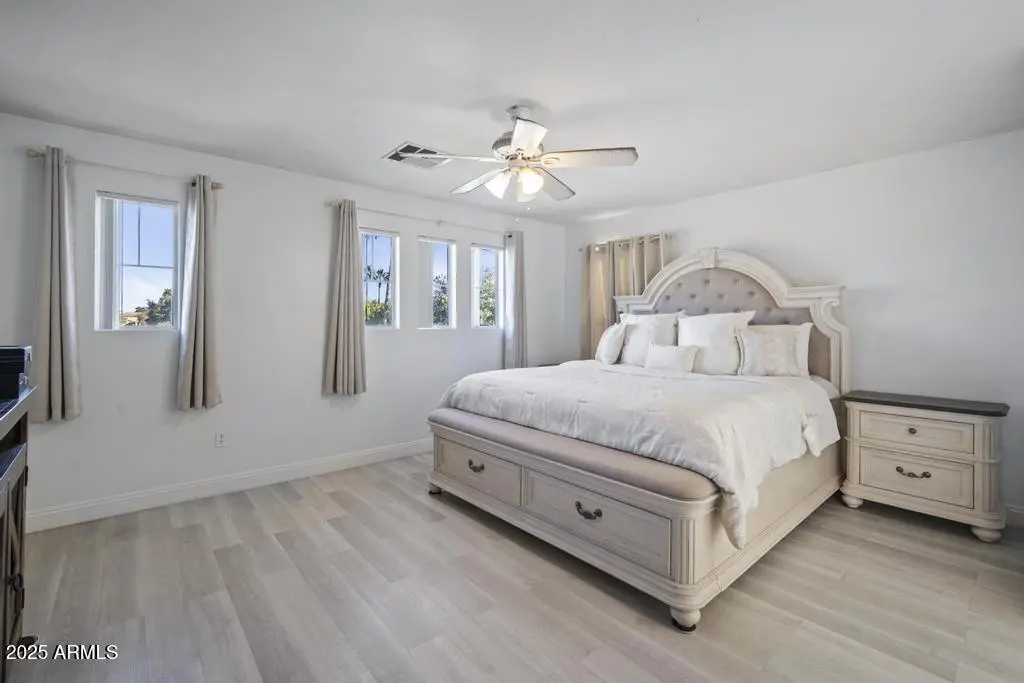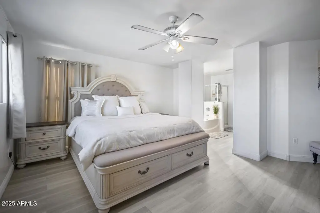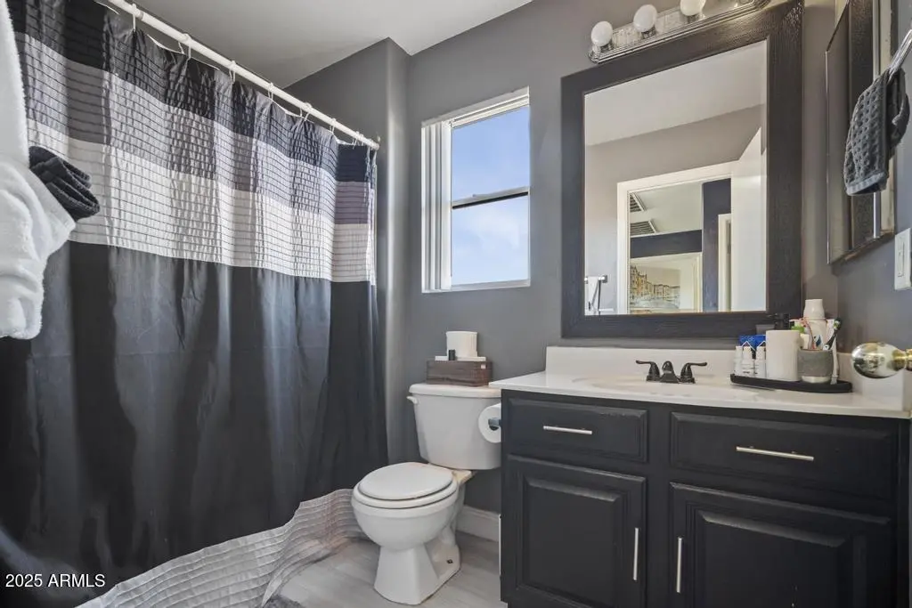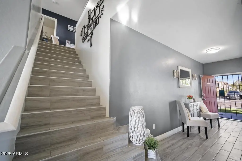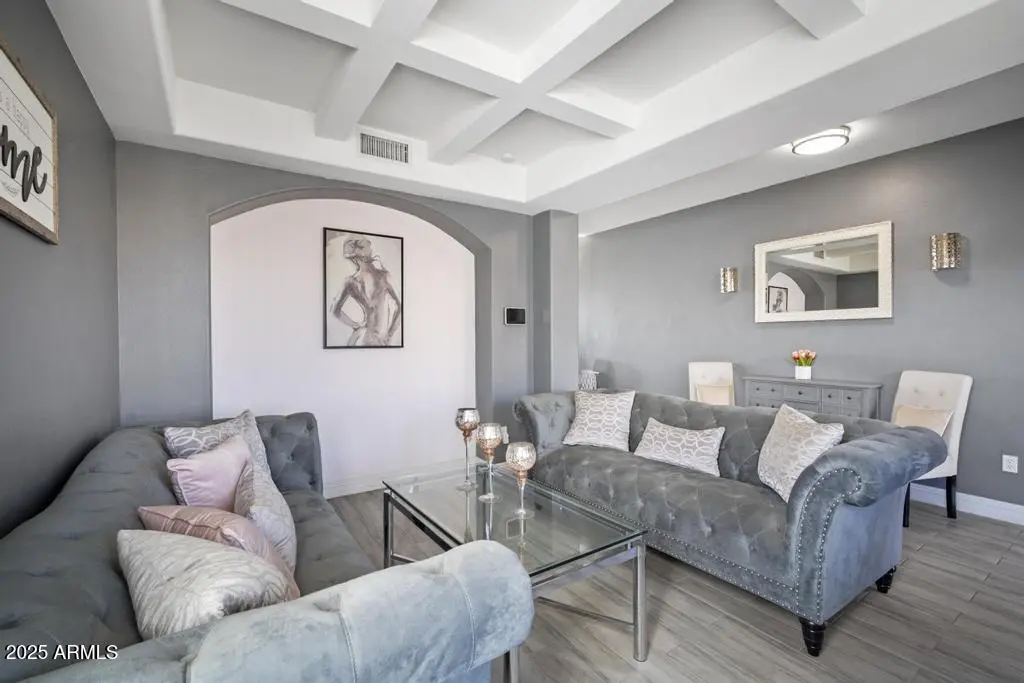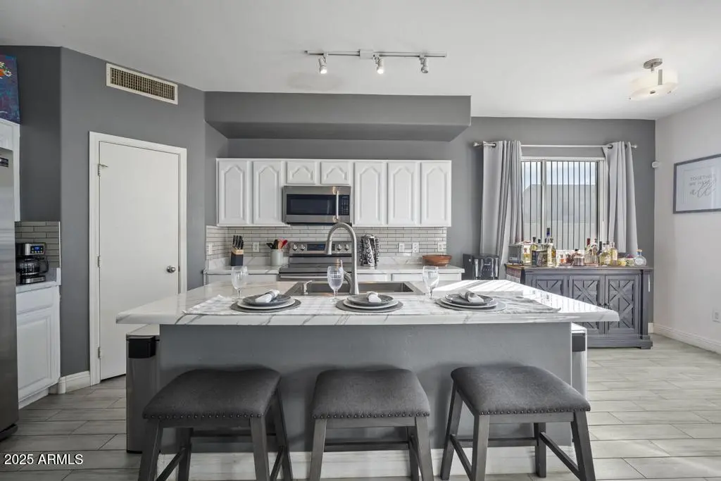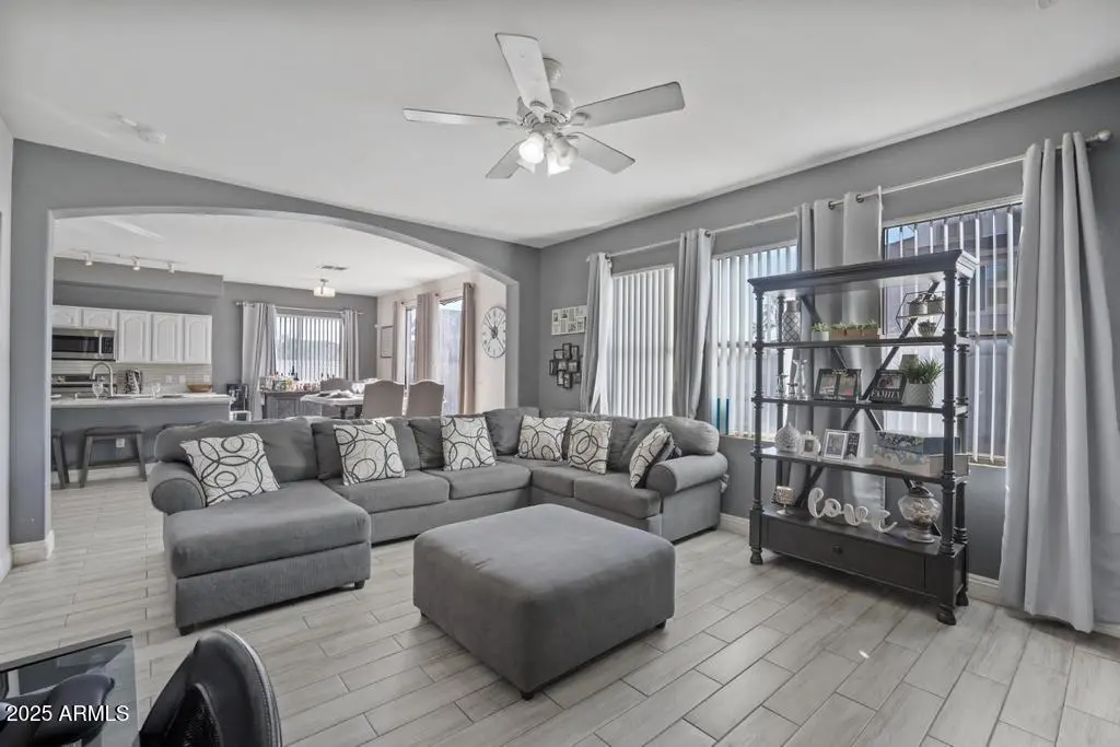 Welcome to the beautifully updated home offering modern style, flexible living spaces, and room to grow. Step inside to a bright, open downstairs featuring a front room with elegant coffered ceilings — perfect as a formal living space or a spacious home office. The main level showcases new flooring throughout and an updated kitchen with freshly painted cabinets and stylish backsplash, flowing seamlessly into the living room with a remodeled gas fireplace and mounted LG TV included. A chic powder bath with an accent wall completes the downstairs. Upstairs, enjoy a generous loft with built-in desk area, ideal for work, play, or an additional lounge. The private primary suite features double-door entry, a relaxing soaking tub, separate shower, dual sinks, and a large walk-in closet.