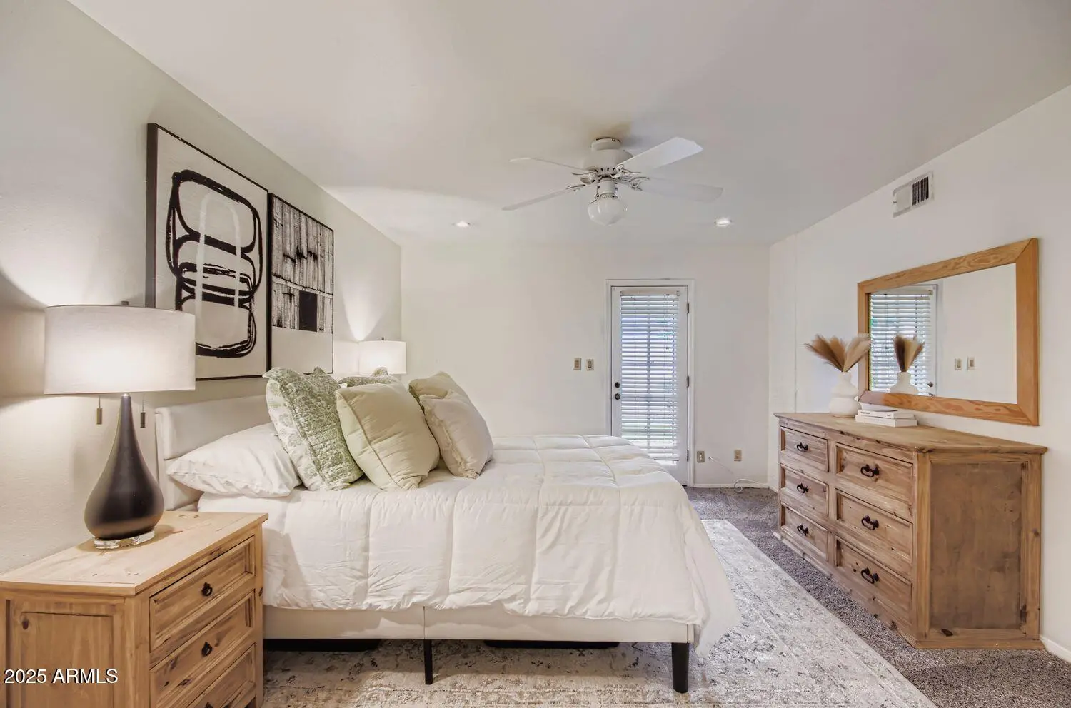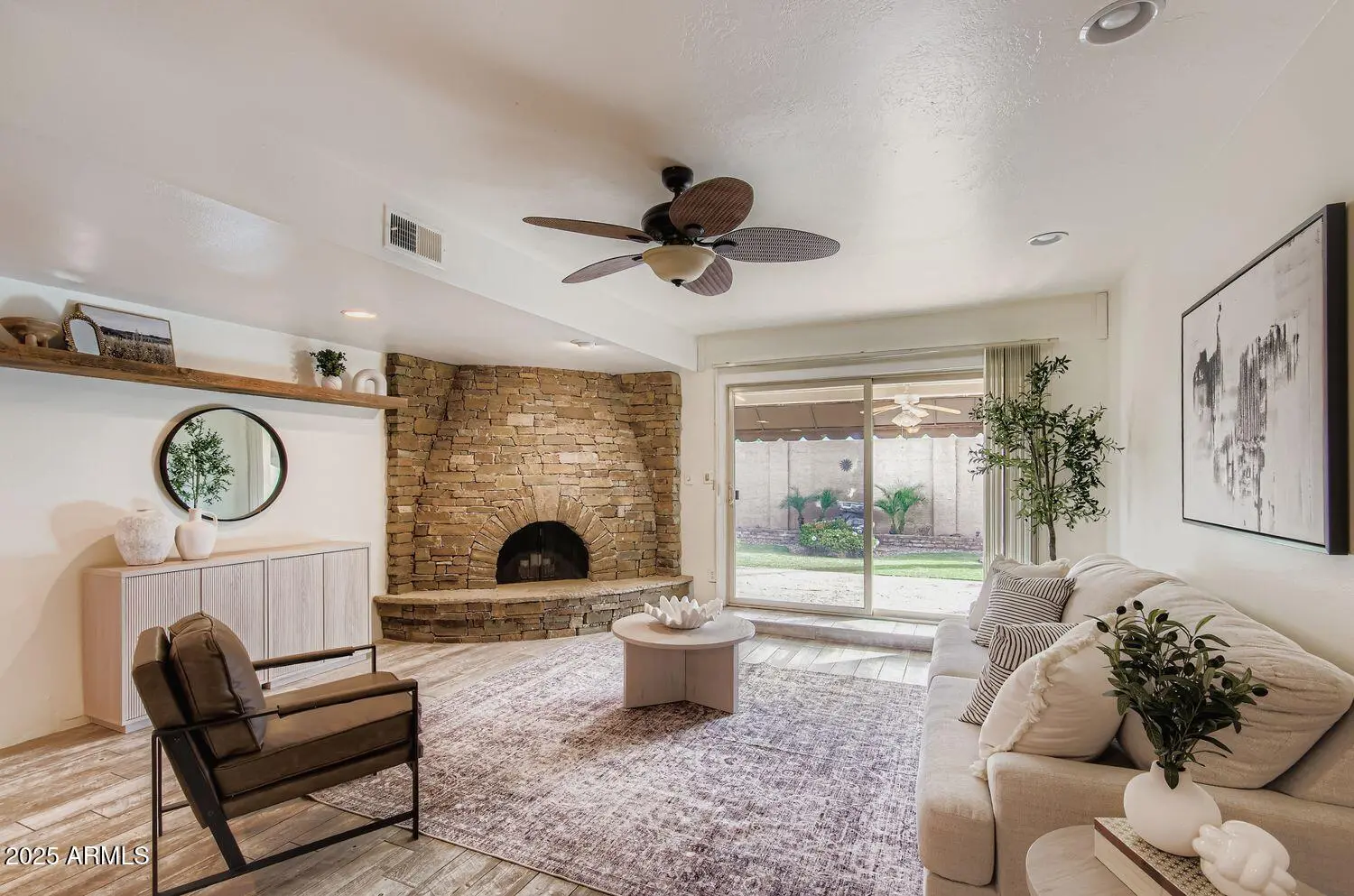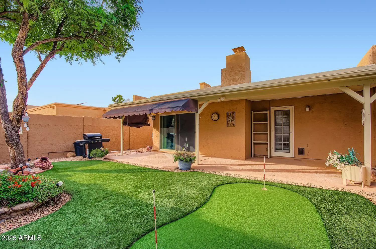 Welcome Home! Discover a rare opportunity to own in one of South Scottsdale's most desirable communities. This beautifully maintained 2-bedroom, 2-bath townhome offers 1,562 sq. ft. of bright, airy living space designed for comfort and style. The inviting floor plan features a cozy fireplace with custom stonework and an updated kitchen with sleek granite countertops, an eat-in dining area, and abundant cabinet space. Step outside to your private backyard oasis, complete with a covered patio and a putting green, perfect for golf enthusiasts. The community offers resort-style amenities including walking paths, a sparkling pool and spa, and tennis and pickleball courts.